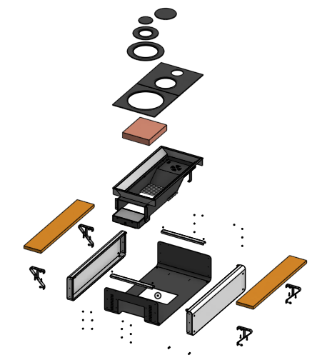 The engineering design of this product focused on improving the combustion, particularly through the product weight and airflow pathways. The following images show the complexity of the airflow paths, which simultaneously cool the exterior of the stove while also controlling the quantity and temperature of the oxygen before it reaches the combustion chamber.